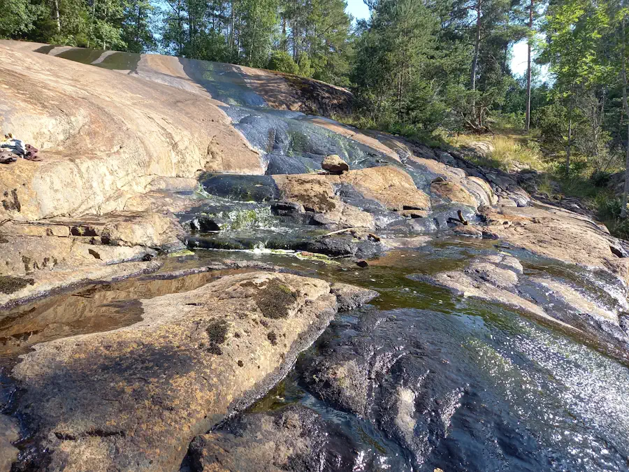 Der Östgöta-Trail ist zu Ende, ich plane nun wieder Tag für Tag. Vimmerby ist zu Fuss zu weit entfernt, Bus und Zug gibt es nur wenige in der Region. Aber in Asby soll es einen Bus nach Österbymo geben. Und dort in der Nähe sind die Brantefallet – ein Fluss, der sich über grosse, flache Steine ergiesst. Das wird also mein nächstes Ziel: insgesamt 16 Kilometer zu Fuss.