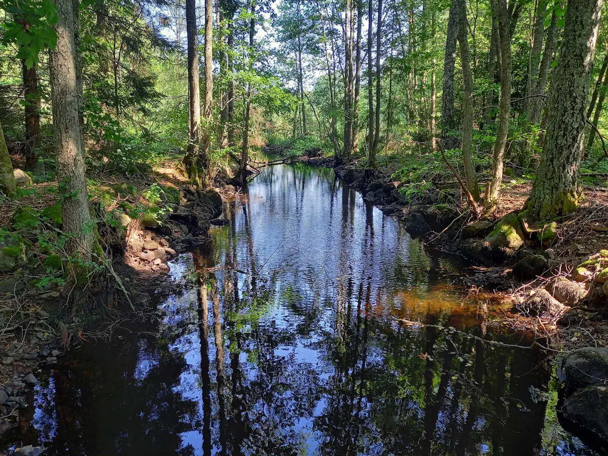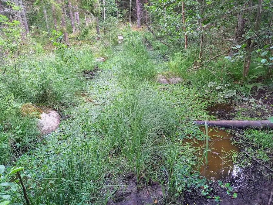 Im Zug nach Rimforsa sehe ich Rothirsche auf den Feldern weiden. Als ich aussteige und in den Wald trete, kann ich mein Glück kaum fassen – schon nach ein paar Schritten nasche ich Heidelbeeren. Zielstrebig gehe ich weiter, ein Hej hier, ein Hej da. Die Schweden alle freundlich, alle lächelnd. Der erste Bach ist atemberaubend, fast dschungelig. In dieser Moorlandschaft ist das Wasser durch den Torf ganz dunkel gefärbt – wie riesiger, schwarzer Tee.