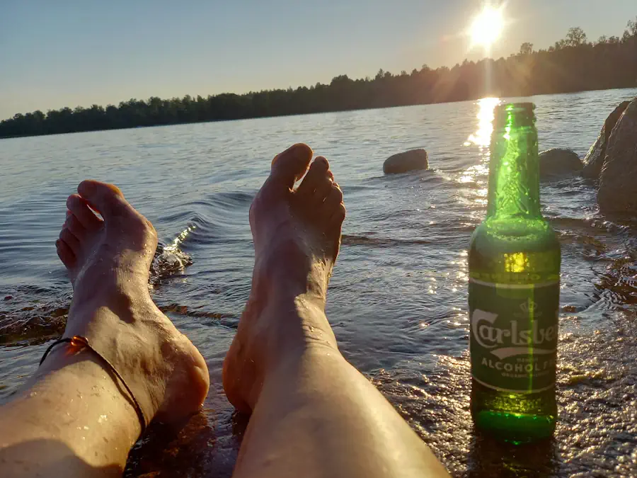 Ein alter, herzlicher Schwede wünscht mir viel Glück auf dem Weg zu den Seen von Malexander. Doch die liegen noch 25 Kilometer entfernt. Auf halbem Weg beschliesse ich, bei einem grossen See zu baden, der ganz in der Nähe liegt. Nur: Keine Strasse, kein Weg führt dorthin. Also kämpfe ich mich 200 Meter durch den Busch. Torflandschaft mit Föhren und Heidelbeeren. Zweimal stolpere ich, falle hin mitsamt den etwa 13 Kilogramm Gepäck. Zum Glück fängt mich der weiche, dicke Torf auf wie ein Kissen. Am See finde ich schliesslich eine kleine Stelle, wo ich schwimmen gehen kann.