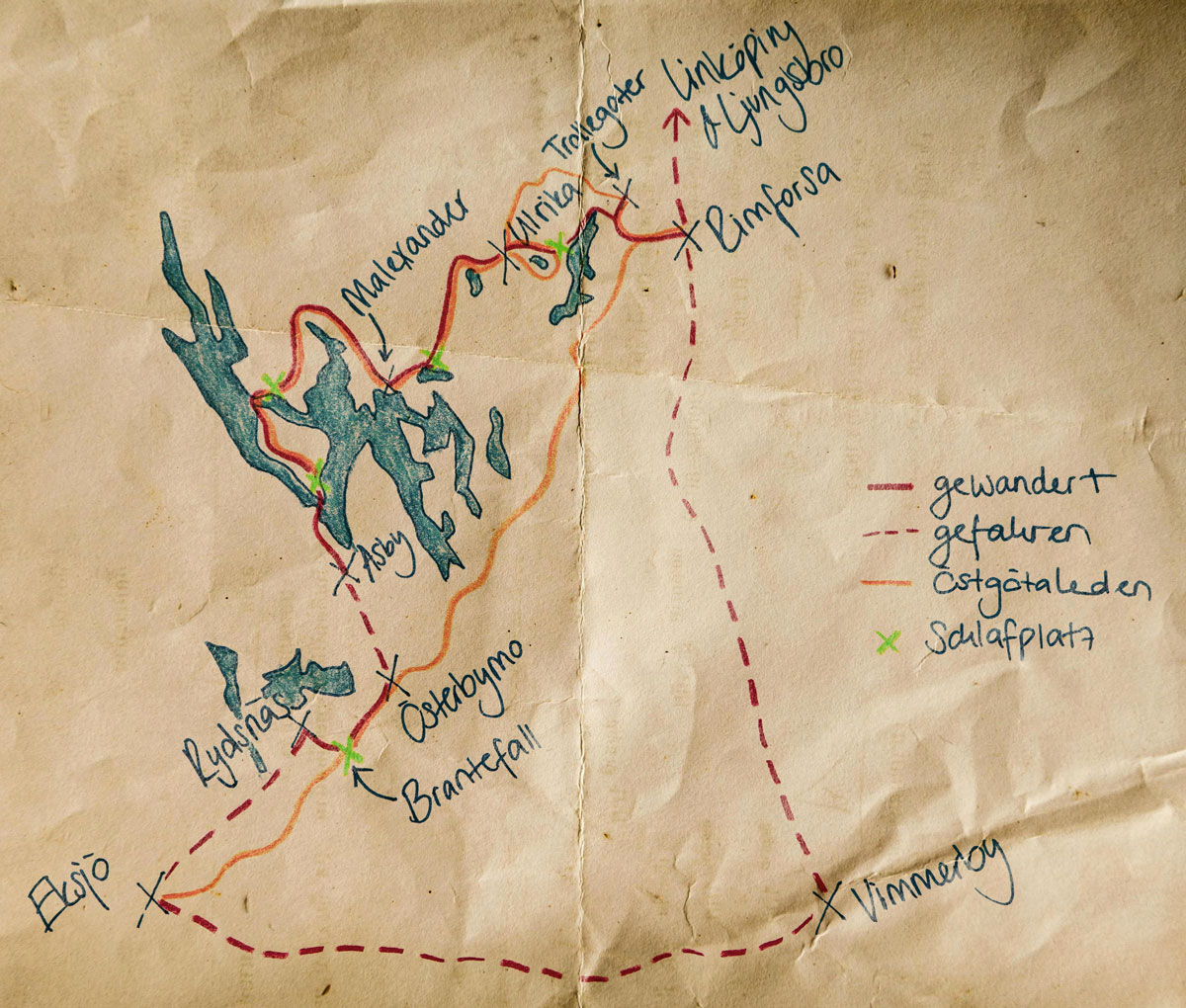 Geplant hatte ich das Ganze eigentlich anders: von Rimforsa über Asby nach Vimmerby, mit teilweise Trails, aber auch vielen Abkürzungen, um überhaupt kilometermässig hinzukommen. Auf dem Navigations-App OsmAnd hatte ich mir meine eigene Route gezeichnet. 25 Kilometer pro Tag, acht Tage insgesamt. So der Plan.